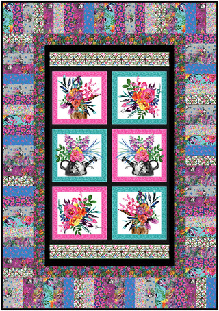 Gardenscape by Rathenart Designs is a 10-piece collection that features a 24” panel with 6 blocks of flowers in watering cans. Patterns include several floral designs, tossed watering cans, and allover wagon wheels. This floral collection is colored in rich tones of turquoise, pink, yellow, orange, and blue. The Verona basic complements these fabrics nicely.